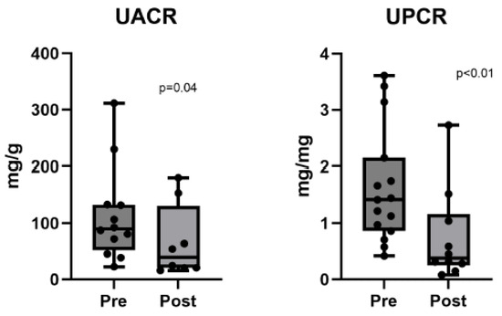 Differences in UPCR (n = 10) and UACR (n = 8) pre- and post-finerenone treatment in patients with nondiabetic chronic kidney disease. UPCR, urine protein-to-creatinine ratio; UACR, urine albumin-to-creatinine ratio.