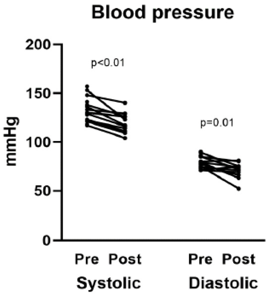 Differences in systolic and diastolic blood pressures pre- and post-finerenone treatment in patients with nondiabetic chronic kidney disease (n = 11).