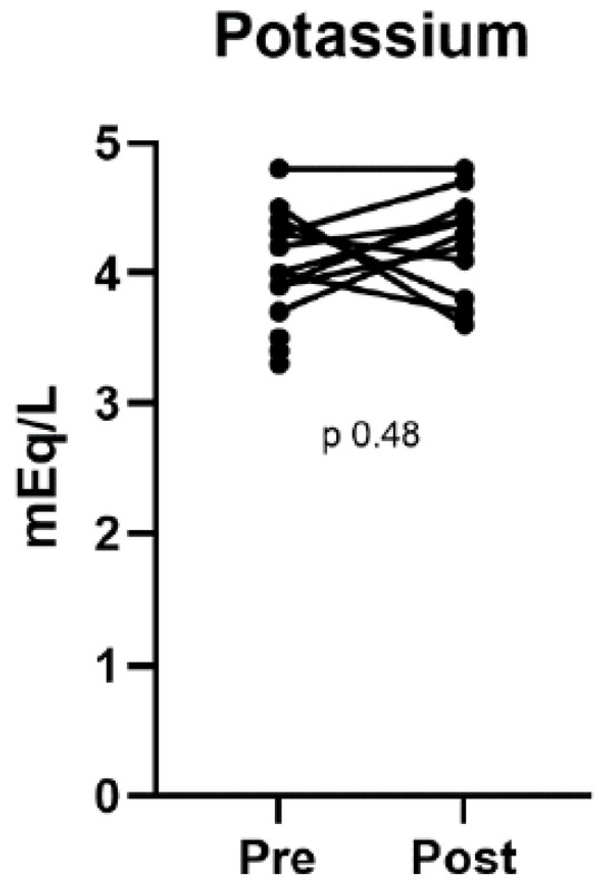 Changes in potassium levels pre- and post-finerenone treatment in patients with nondiabetic chronic kidney disease (n = 12).
