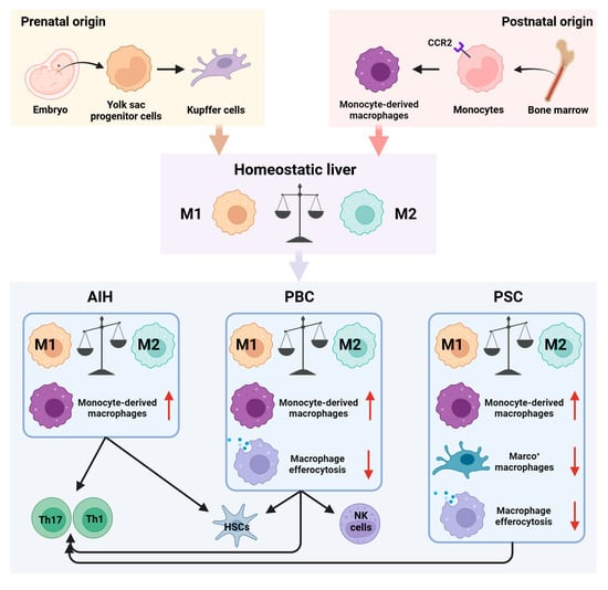 Within the hepatic environment, macrophages constitute the predominant innate immune cell population, accounting for about 20% of non-parenchymal cells in healthy liver tissue []. These macrophages play integral roles in immunological surveillance, tissue remodeling, and homeostatic maintenance. Liver macrophages are classified principally as resident Kupffer cells, derived from embryonic yolk-sac progenitors, and monocyte-derived macrophages (MoMFs), originating from circulating monocytes (Figure 1). Kupffer cells function predominantly as immune sentinels, maintaining hepatic tolerance by recognizing and eliminating invading pathogens, whereas MoMFs, responsive to inflammatory cues, orchestrate local inflammatory responses and mediate tissue repair processes [,]. Moreover, macrophages exhibit significant functional plasticity, dynamically transitioning into either pro-inflammatory (M1) or anti-inflammatory (M2) phenotypes, modulated by local microenvironmental signals []. Mounting evidence implicates dysregulated macrophage polarization and functional impairment as critical factors in the pathogenesis of chronic inflammation, cholangiopathy, and hepatic fibrosis associated with AILDs, underscoring their pivotal roles in disease progression [,,].