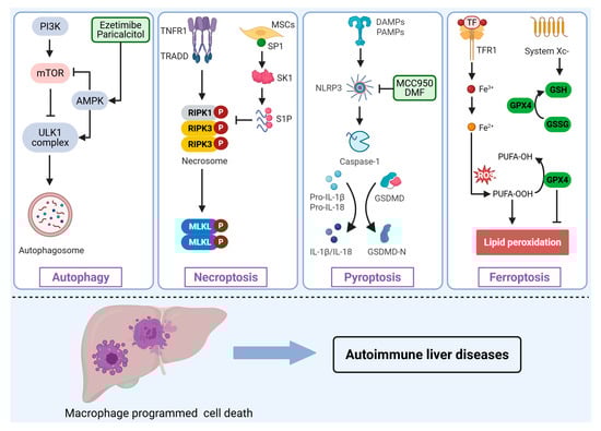 Accumulating evidence implicates macrophage necroptosis in AILD pathogenesis. Elevated RIPK3 expression in hepatic macrophages of AIH patients positively correlates with liver injury severity []. Additionally, disruption of the specificity protein 1 (Sp1)/sphingosine kinase-1 (SK1)/sphingosine-1-phosphate (S1P) signaling axis observed in AIH enhances necroptotic activity, thereby exacerbating inflammation []. Interestingly, pharmacological interventions such as broad-spectrum caspase inhibitors (e.g., zVAD) can divert macrophage cell death from apoptosis to necroptosis, paradoxically ameliorating liver damage in experimental AIH models []. In pediatric livers from patients with biliary atresia and in mice subjected to bile duct ligation, bile acid metabolites such as glycodeoxycholic acid (GDCA) trigger macrophage necroptosis via S1PR2-ZBP1-MLKL signaling, exacerbating inflammatory and fibrotic responses []. Furthermore, caspase-10 mutations identified in PBC may simultaneously activate necroptosis and pyroptosis in macrophages, whereas therapies with ursodeoxycholic acid or obeticholic acid can partially reverse these aberrant death pathways []. Thus, targeting macrophage necroptosis represents a potentially valuable therapeutic strategy in AILDs treatment.