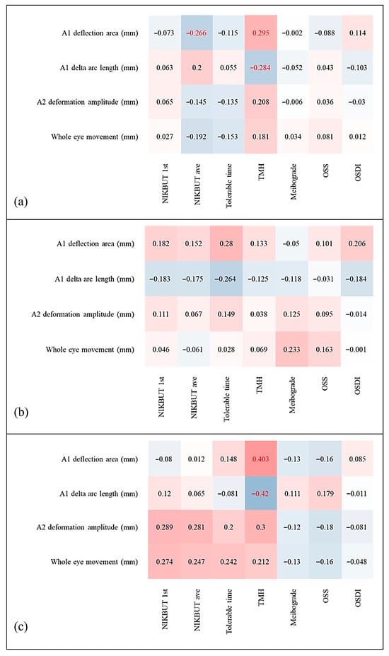 Correlation matrices between Corvis ST corneal biomechanical parameters and K5M parameters for (a) all patients, (b) non-DED subjects only, and (c) DED subjects only. Red columns show positive correlations, and blue columns show negative correlations; darker shades indicate stronger relationships. Red statistics indicate statistical significance.
