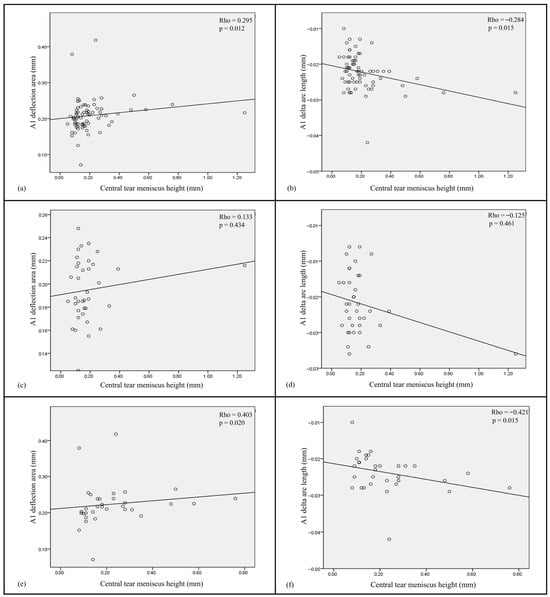 Scatter plots show correlations between two significant corneal biomechanical parameters (A1 deflection area and A1 delta arc length) and the tear meniscus height for (a,b) all subjects, (c,d) non-DED patients, and (e,f) DED subjects.