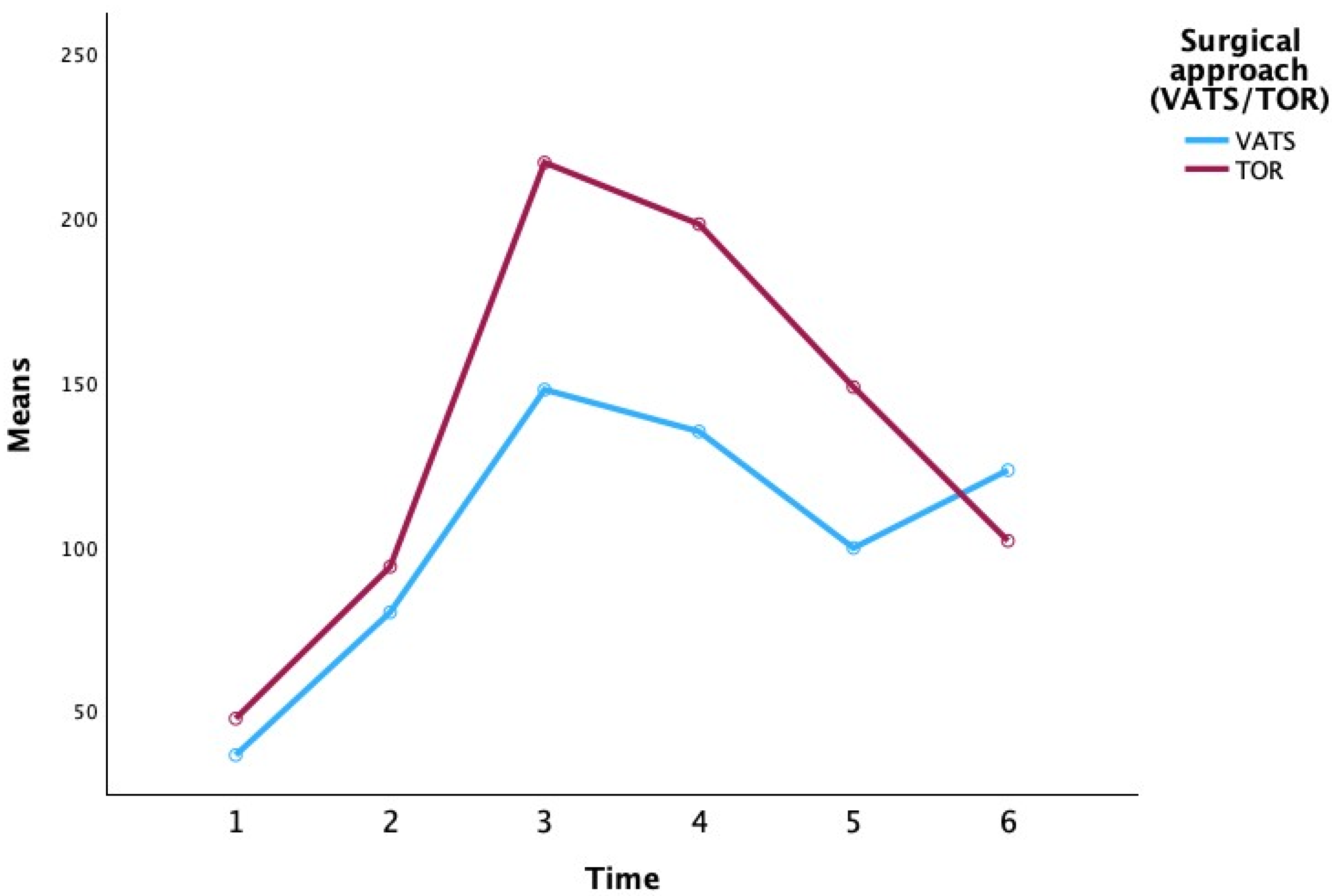 p > 0.10), and the proportion of males was slightly higher in the open thoracotomy group (67% vs. 55%). We conducted a repeated-measures analysis of variance (ANOVA) to examine changes in CRP levels over time and to assess whether these changes differed by surgical approach (video-assisted thoracoscopic surgery, VATS, vs. open thoracotomy, TOR) (