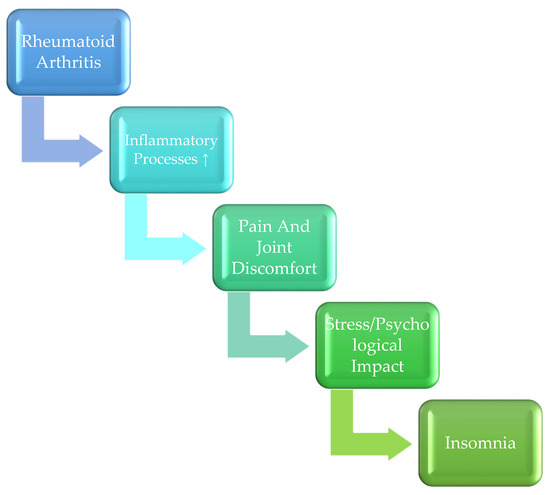 Insomnia may exacerbate RA activity through multiple overlapping pathways. On a biological level, sleep disruption elevates pro-inflammatory cytokines such as IL-6 and TNF-α, disrupts circadian rhythm regulation, and impairs immune homeostasis. On a psychological level, comorbid depression and anxiety may further impair sleep quality, creating a self-reinforcing cycle of poor rest and heightened disease activity [47,48].