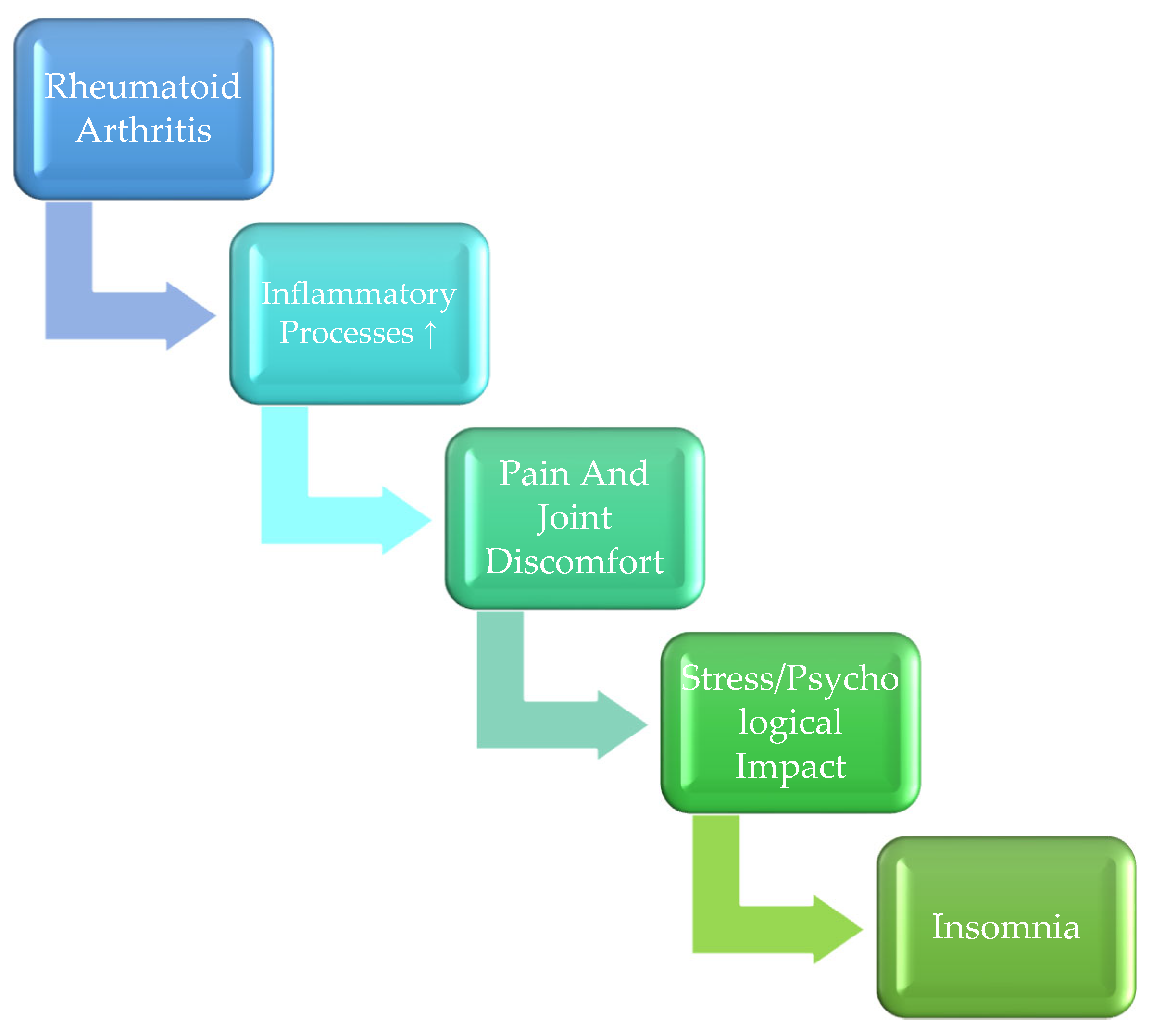 - Yaseen, A.; Yasin, S.; Ul Haq, Z.; Ahmad, I.; Hussain, M.; Pervez, N. Frequency of Sleep Disorders in Rheumatoid Arthritis Patients. Cureus 2024, 16, e72417. [Google Scholar] [CrossRef] [PubMed]