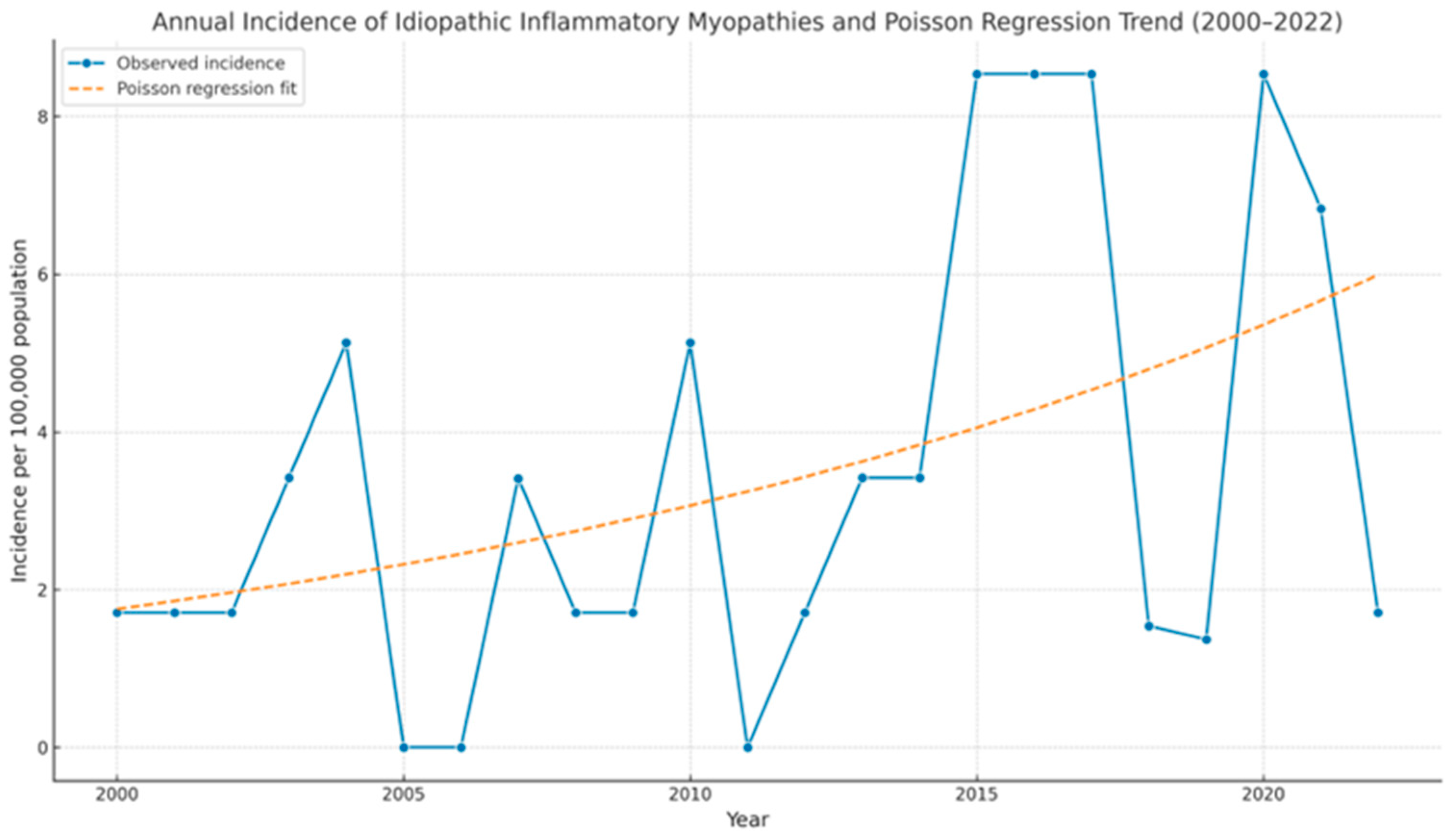 APA StyleCorrales-Selaya, C., Prieto-Peña, D., Martínez-López, D., Benavides-Villanueva, F., & Blanco, R. (2025). Epidemiology of Dermatomyositis and Other Idiopathic Inflammatory Myopathies in Northern Spain. Biomedicines, 13(10), 2537. https://doi.org/10.3390/biomedicines13102537