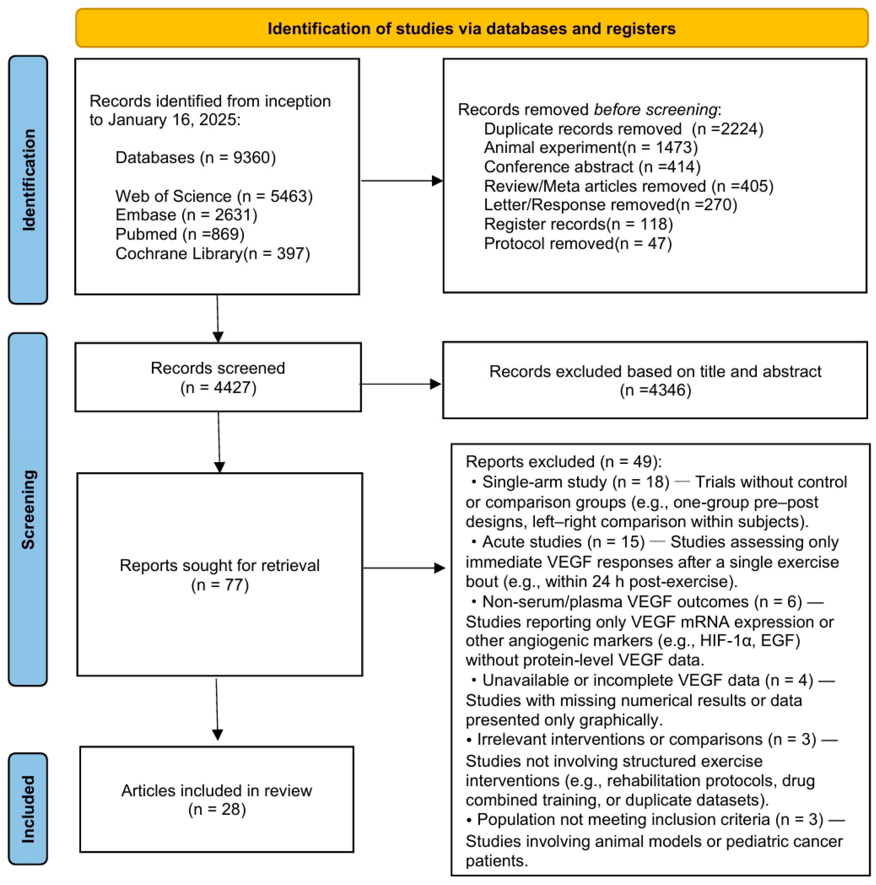 Jiang, L.; Ding, H.; Lee, D.; Chun, B. The Optimal Type and Dose of Exercise Interventions on VEGF Levels in Healthy Individuals, as Well as Obesity and Chronic Disease Populations: A Network Meta-Analysis. Biomedicines 2025, 13, 2548. https://doi.org/10.3390/biomedicines13102548