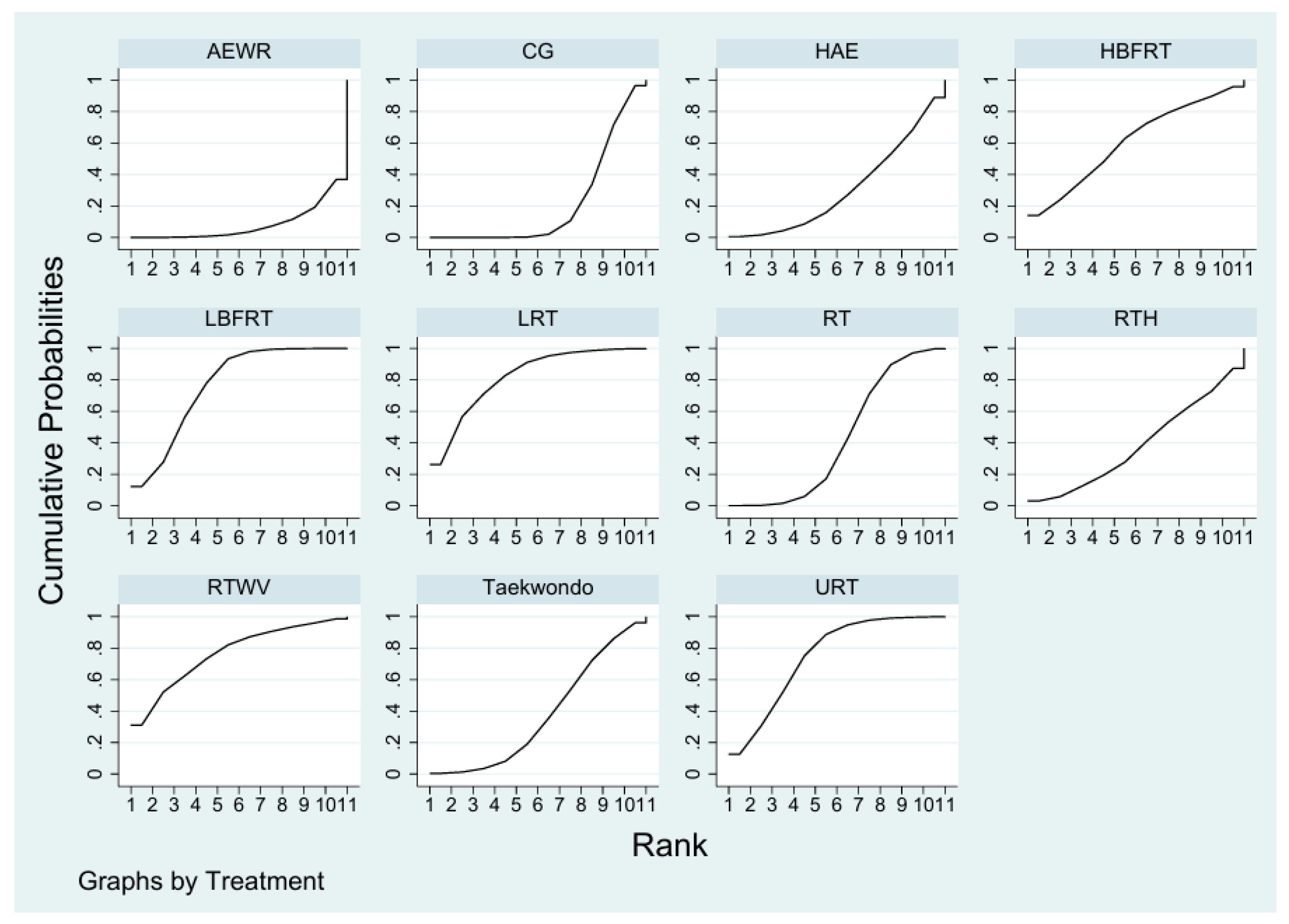 Healthy adults | 11 | 313 | 18–80 | RT, LBFRT, AEWR, Taekwondo, RTWV | 200–1950 | Plasma/Serum; ELISA | Lower-limb RT and Taekwondo significantly increased VEGF; effect most evident ≥600 METs-min/week |