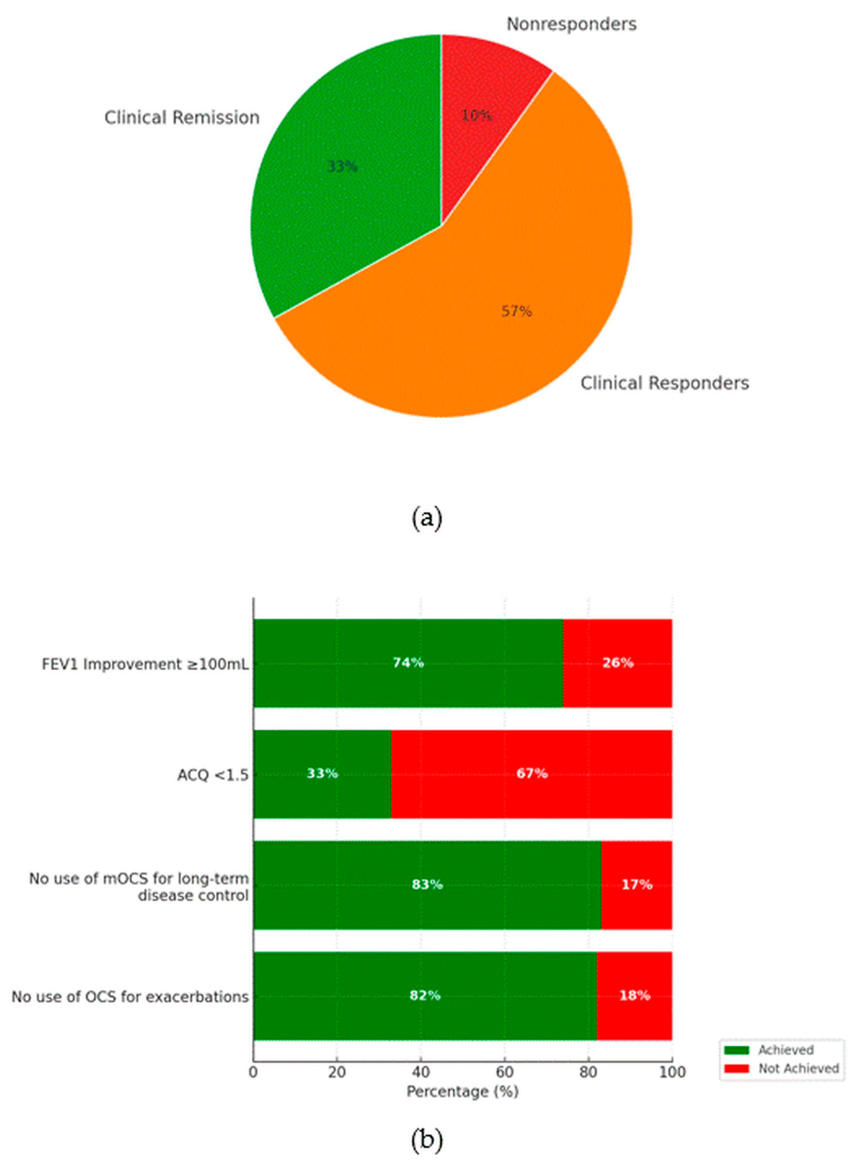 - Damiański, P.; Białas, A.J.; Kołacińska-Flont, M.; Elgalal, A.; Jarmakowska, K.; Kierszniewska, D.; Panek, M.; Kardas, G.; Kuna, P.; Kupczyk, M. Pathway to Remission in Severe Asthma: Clinical Effectiveness and Key Predictors of Success with Benralizumab Therapy: A Real-Life Study. Biomedicines 2025, 13, 887. [Google Scholar] [CrossRef] [PubMed]