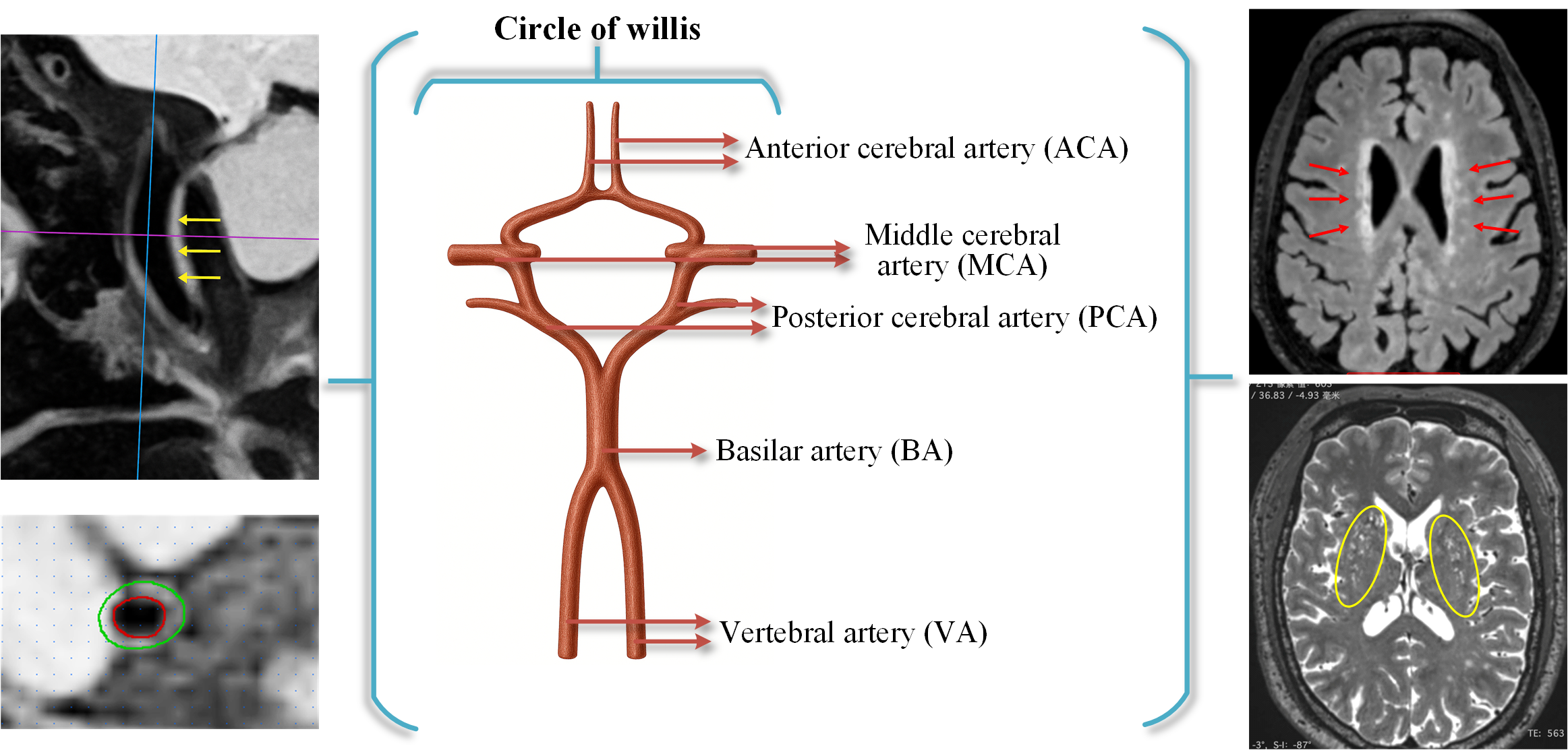 - Bai, X.; Fan, P.; Li, Z.; Mossa-Basha, M.; Ju, Y.; Zhao, X.; Kong, Q.; Pei, X.; Zhang, X.; Sui, B.; et al. Evaluating Middle Cerebral Artery Plaque Characteristics and Lenticulostriate Artery Morphology Associated With Subcortical Infarctions at 7T MRI. J. Magn. Reson. Imaging 2023, 53, 1045–1055. [Google Scholar] [CrossRef] [PubMed]