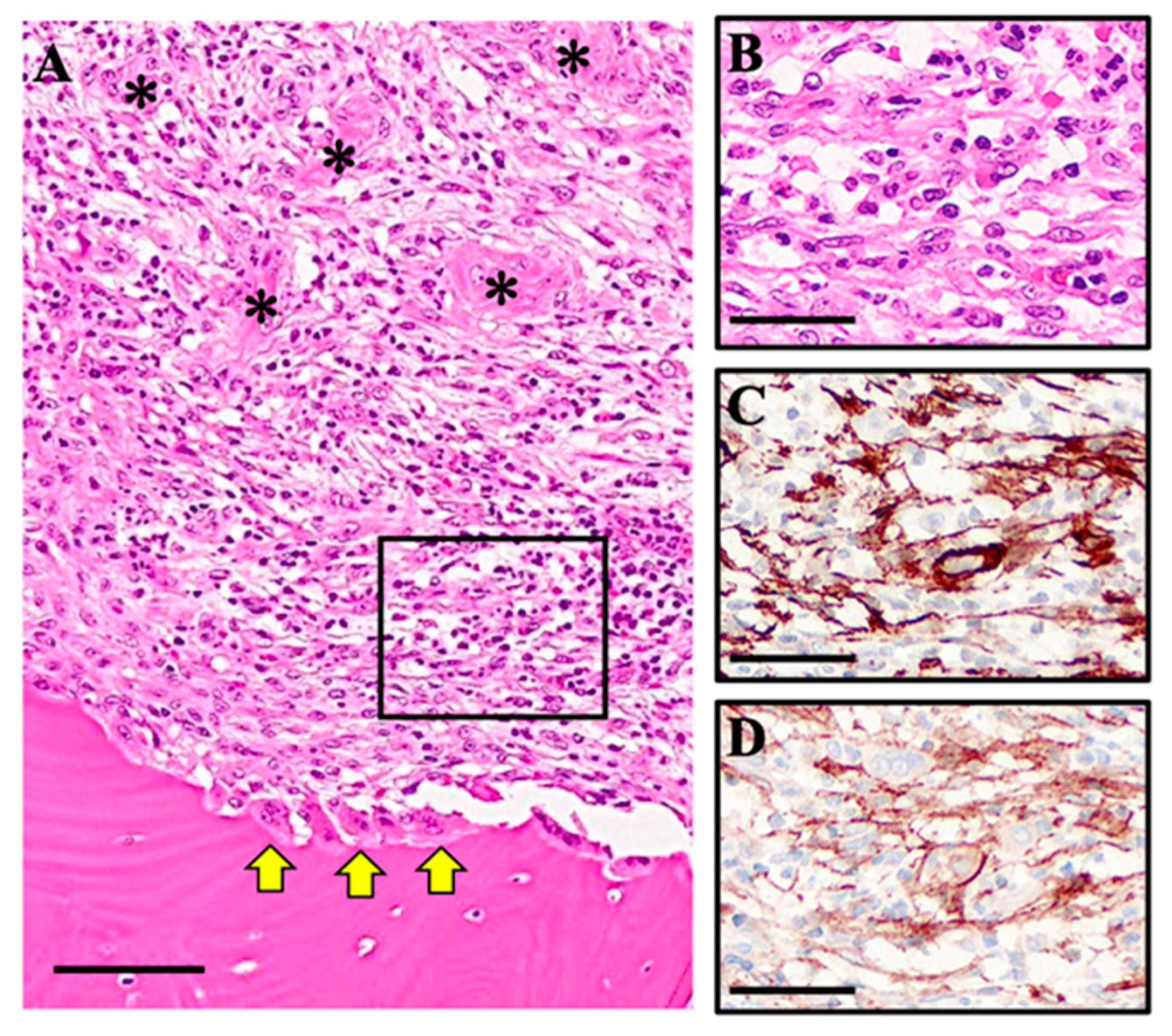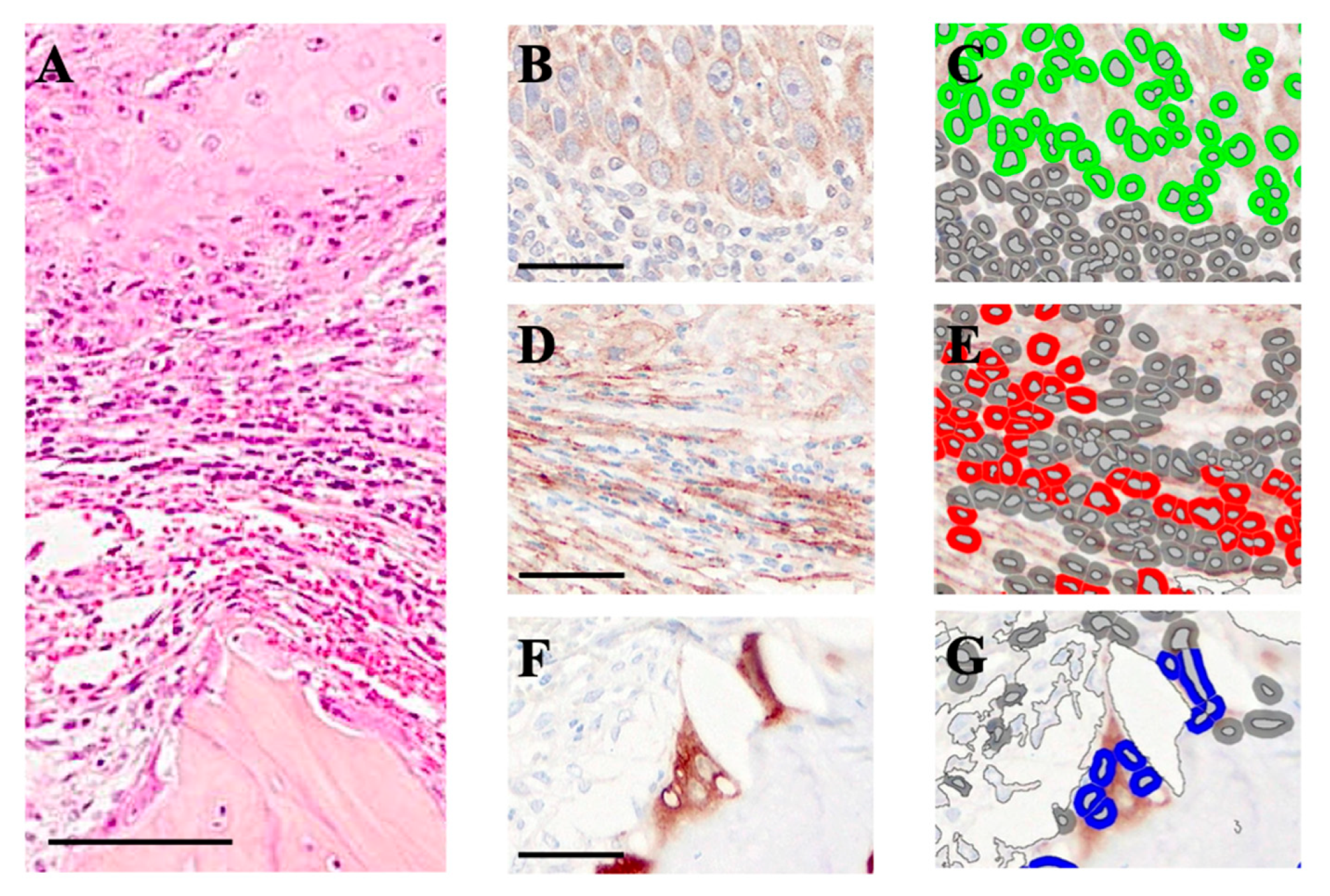 - Gao, A.; Kim, D.W.; Pei, M.; Kim, K.Y.; Park, Y.J.; Nam, W.; Kim, H.J.; Kim, H.S.; Cha, I.H.; Zhang, X. Implications of TP-positive CAFs in the Bone Invasion of Oral Squamous Cell Carcinoma. Anticancer Res. 2024, 44, 3365–3374. [Google Scholar] [CrossRef] [PubMed]