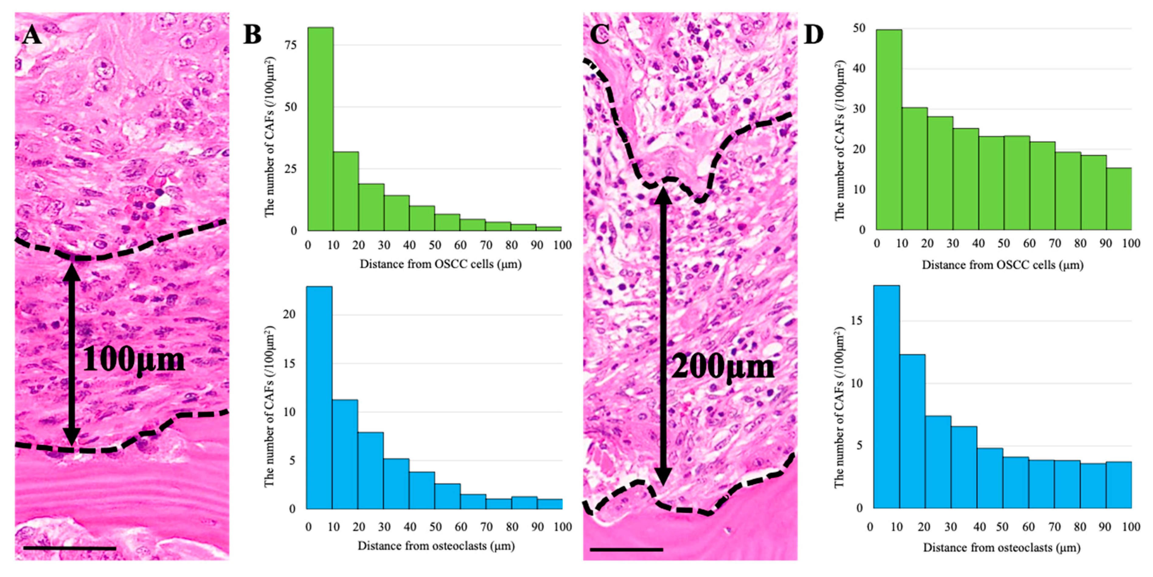 3.2. Quantification of CAFs in the Vicinity of OSCC Cells and Osteoclasts