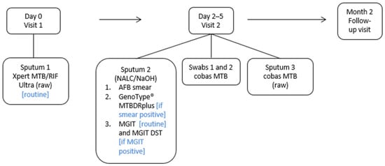 Specimens for routine and study testing were collected over two visits approximately 2–5 days apart. Arrows indicate the chronological flow of study visits and specimen collection. Day 0 (Visit 1) procedures were followed by Day 2–5 (Visit 2), and subsequently by the Month 2 follow-up visit. Blue text in brackets indicates conditions under which specific tests were performed. AFB, acid-fast bacilli; MGIT, mycobacterial growth indicator tube; DST, drug susceptibility testing; NALC/NaOH, N-acetyl-L-cysteine–sodium citrate–sodium hydroxide; BD, Becton Dickinson
