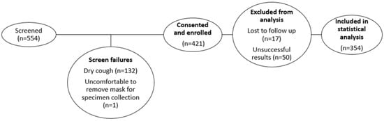 A total of 554 participants were screened for the study (Figure 2). Of these, 133 were excluded during the recruitment process, and 421 participants gave consent and were enrolled. Of those enrolled, 67 participants were excluded, yielding a final sample of 354 participants for statistical analysis. Characteristics of the study population are shown in Table 1. The average age of participants was 39 years, and most (64%) were male. As indicated by their BMI, a total of 28/66 (42%) participants diagnosed with active TB were malnourished. Among participants with a known HIV status, 57% (199/351) were positive. Forty-two reported a previous TB episode. TB was microbiologically confirmed on liquid culture in 64/354 (18%) of participants. A total of 290 participants did not have microbiologically confirmed TB and were consequently classified as not having active TB disease. The culture contamination rate was 11% (43/404); of these, the Ultra and Cobas MTB assays detected one MTBC-positive specimen, and the participant reported an improvement in symptoms after having received treatment. Sixty-six participants were microbiologically confirmed to have TB using the Xpert Ultra assay.