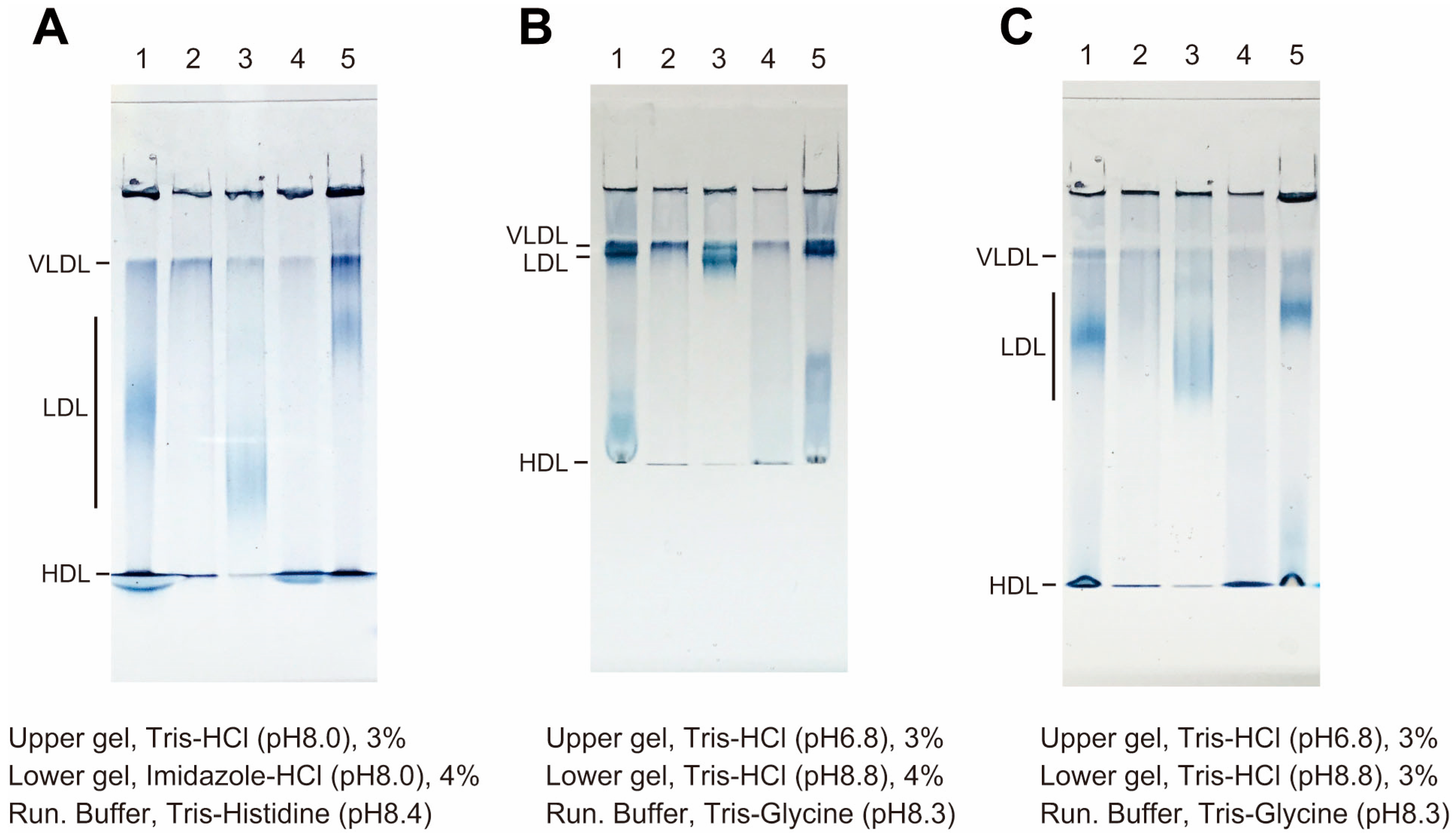 - Nakano, T.; Inoue, I.; Seo, M.; Takahashi, S.; Awata, T.; Komoda, T.; Katayama, S. Rapid and simple profiling of lipoproteins by polyacrylamide-gel disc electrophoresis to determine the heterogeneity of low-density lipoproteins (LDLs) including small, dense LDL. Recent Pat. Cardiovasc. Drug Discov. 2009, 4, 31–36. [Google Scholar] [CrossRef] [PubMed]