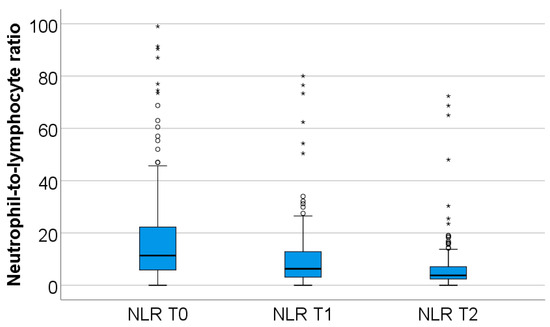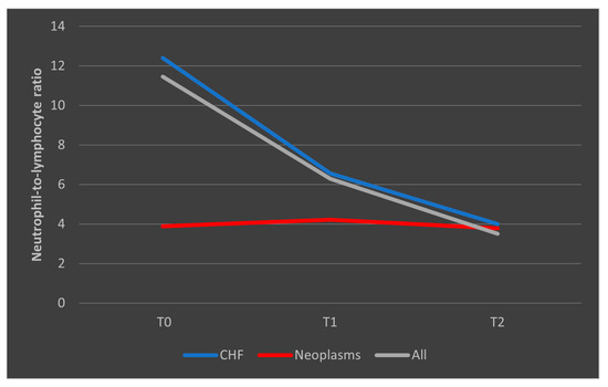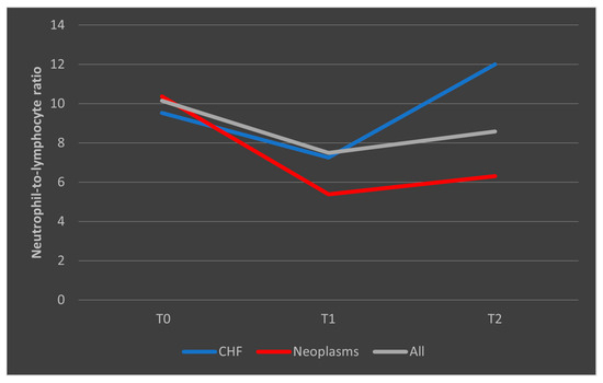 The dynamics of neutrophil-to-lymphocyte ratio values from T0 to T2, observed in the study group, are shown in Figure 1.