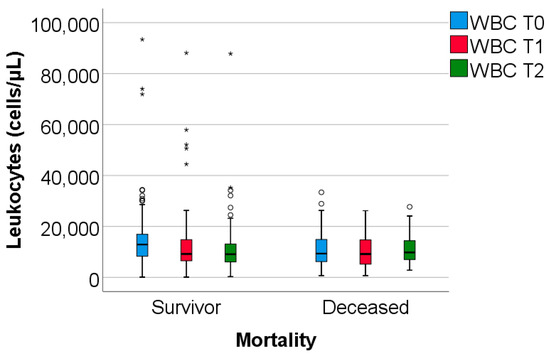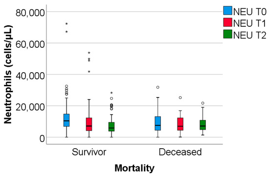 Data from Table 3 and Figure 2, Figure 3 and Figure 4 show that while deceased patients had a stable inflammatory profile during admission, having no significant differences in evolution of leukocytes (p = 0.413), neutrophils (p = 0.468), lymphocytes (p = 0.190) or NLR (p = 0.852), surviving patients had a similar pattern to the general cohort, maintaining a significant decrease from T0 to T1/T2 of leukocytes/neutrophils/NLR (T0/T1: p < 0.001/p < 0.001/p < 0.001, T0/T2: p < 0.001/p < 0.001/p < 0.001), with no significant differences from T1 to T2 of leukocytes/neutrophils (p = 0.407/p = 0.056), NLR having a significant decrease from T1 to T2 (p < 0.001), associated with a significant increase in lymphocytes from T0 to T1 (p = 0.001), T0 to T2 (p < 0.001) and T1 to T2 (p < 0.001).