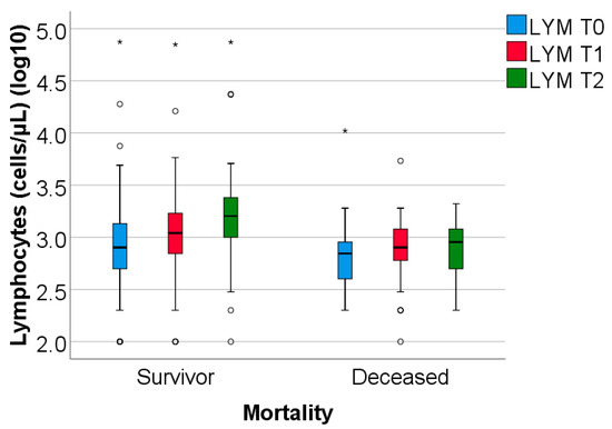 The dynamics of lymphocytes were observed at T0, T1, and T2. LYM = lymphocytes (illustrated as base10 logarithmic values). T0, T1, and T2 = Time 0, 1, and 2. (*) = outliers values.