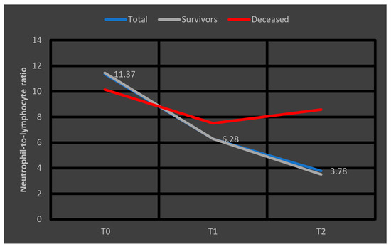 Regarding the dynamics of NLR values, we depicted in Figure 5 the median values at T0, T1, and T2 observed in the entire cohort, as well as separately in survivors and deceased patients. It is evident that, in survivors, these values approach the considered optimal range (1–3) [19], a trend not observed in patients who later died.