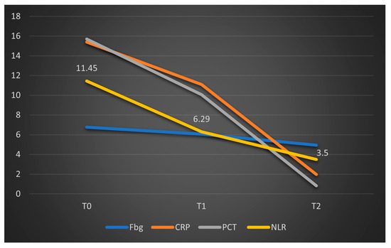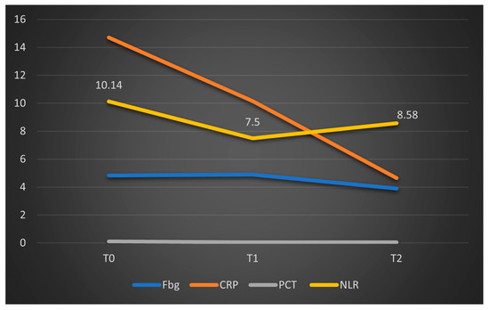 Dynamics of the median values of inflammatory parameters and NLR at T0, T1, and T2 in patients who survived. Legend: Fbg = Fibrinogen, CRP = C-reactive protein, PCT = procalcitonin, NLR = neutrophil-to-lymphocytes ratio. T0, T1, and T2 = Time 0, 1, and 2.