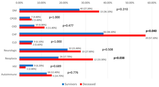 In our study, we assessed the potential implications related to the observed mortality. The results show that most of the tested comorbidities did not exhibit significant differences in relation to mortality (p > 0.05), except for chronic heart failure (57.1% vs. 38.1%, p = 0.040) and neoplasia (33.3% vs. 17.7%, p = 0.038), where patients with these comorbidities were significantly more associated with mortality (Figure 8).