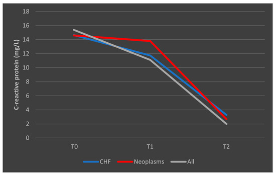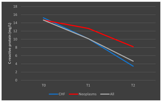 In the case of CRP, deceased patients with CHF had a trajectory similar to the overall trend, while patients with malignancies had a consistent trajectory from T0 to T1 with a slight decrease from T1 to T2 (Figure 11). A similar trend was observed in patients who survived, as presented in Figure 12.