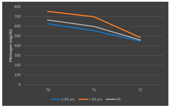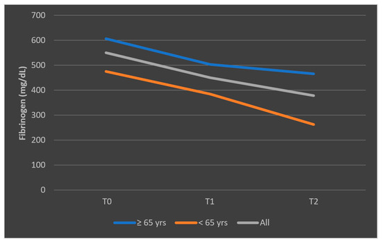Evolution of mean fibrinogen levels in patients who survived the sepsis episode, according to age categories (<65 years, ≥65 years). T0, T1, and T2 = Time 0, 1, and 2.
