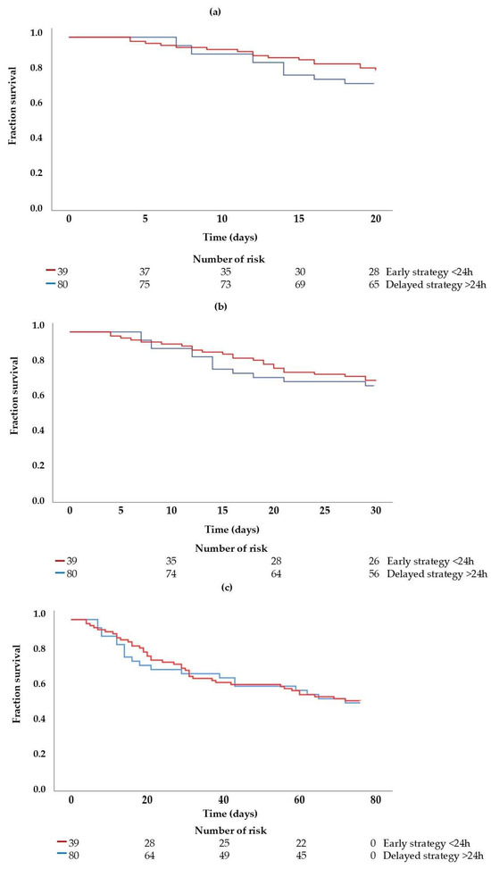 Survival curves according to the groups, early strategy < 24 h and delayed strategy >24 h, over a 20-day follow-up period (a), 30 days (b), and 76 days (c). Log-rank test to 20 days (a) p = 0.396; 30 days (b) p = 0.742; 76 days (c) p = 0.932. Breslow test to 20 days (a) p = 0.391; 30 days (b) p = 0.667; 76 days (c) p = 0.840. Tarone–Ware test to 20 days (a) p = 0.392; 30 days (b) p = 0.702; 76 days (c) p = 0.886.