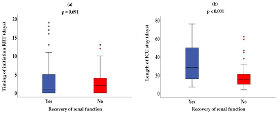 Timing of initiation of renal replacement therapy (RRT) (a) in days and length of intensive care unit (ICU) stay (b) in days, according to recovery of renal function of the patients. Colored dots represent individual outliers.