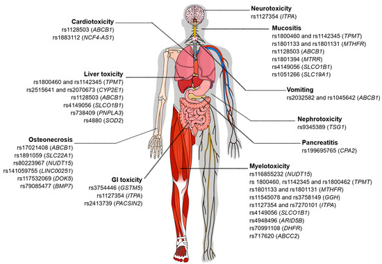 Genetic variants associated with toxicity related to the treatment of acute leukemias. The figure illustrates different types of chemotherapy-induced toxicities and the genetic variants described in the literature that are associated with each adverse manifestation. Among the toxicities represented are neurotoxicity, cardiotoxicity, hepatotoxicity, pancreatitis, gastrointestinal toxicity, nephrotoxicity, myelotoxicity, mucositis, vomiting, and osteonecrosis. For each type of toxicity, single-nucleotide polymorphisms (SNPs) and the corresponding genes potentially involved in individual susceptibility to these adverse events are indicated. Figure created in the Mind the Graph platform (www.mindthegraph.com (accessed on 3 September 2025)).