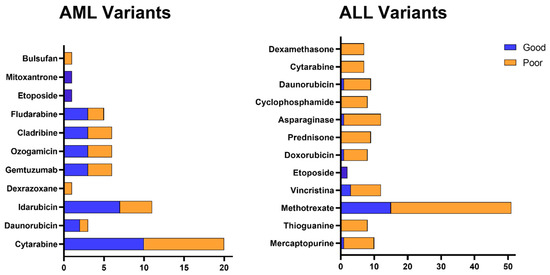 Therefore, this study aimed to compile all variants described in the ClinPGx/PharmGKB database for acute myeloid leukemia (AML) and acute lymphoblastic leukemia (ALL), identifying the main effects of the presence of each variant in relation to the efficacy of treatment with chemotherapy and the adverse effects resulting from drug toxicity.