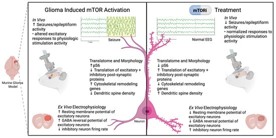 Tumor-induced mTOR-driven alterations to peritumoral neurons contribute directly to the cortical dysfunction observed in peritumoral tissue. In vivo EEG recordings demonstrated an increase in spontaneous epileptiform activity during tumor progression [113]. Furthermore, in vivo two-photon calcium imaging of excitatory peritumoral neurons in functional cortex demonstrated the presence of tumor-induced alterations to physiological stimulation [11]. Specifically, peritumoral neurons in the somatosensory cortex exhibited increased response amplitude and delayed timing to whisker stimulation [11]. Importantly, acute mTOR inhibition with AZD8055 reduced epileptiform activity and normalizes the excitatory neuron response to physiological stimulation in functional cortex, demonstrating its ability to reverse tumor-induced neurological dysfunction in vivo [11,113]. Altogether, these findings establish mTOR as a key mediator of tumor-induced neurological dysfunction and highlight its translational potential as a target for restoring circuit level function in brain tumors (Figure 2).