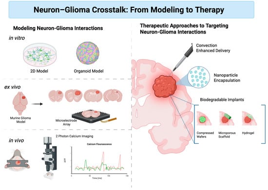 - Gill, B. Figure 3. Neuron–Glioma Crosstalk: From Modeling to Therapy. Created in BioRender. 2025. Available online: https://BioRender.com/84igv1s (accessed on 20 October 2025).