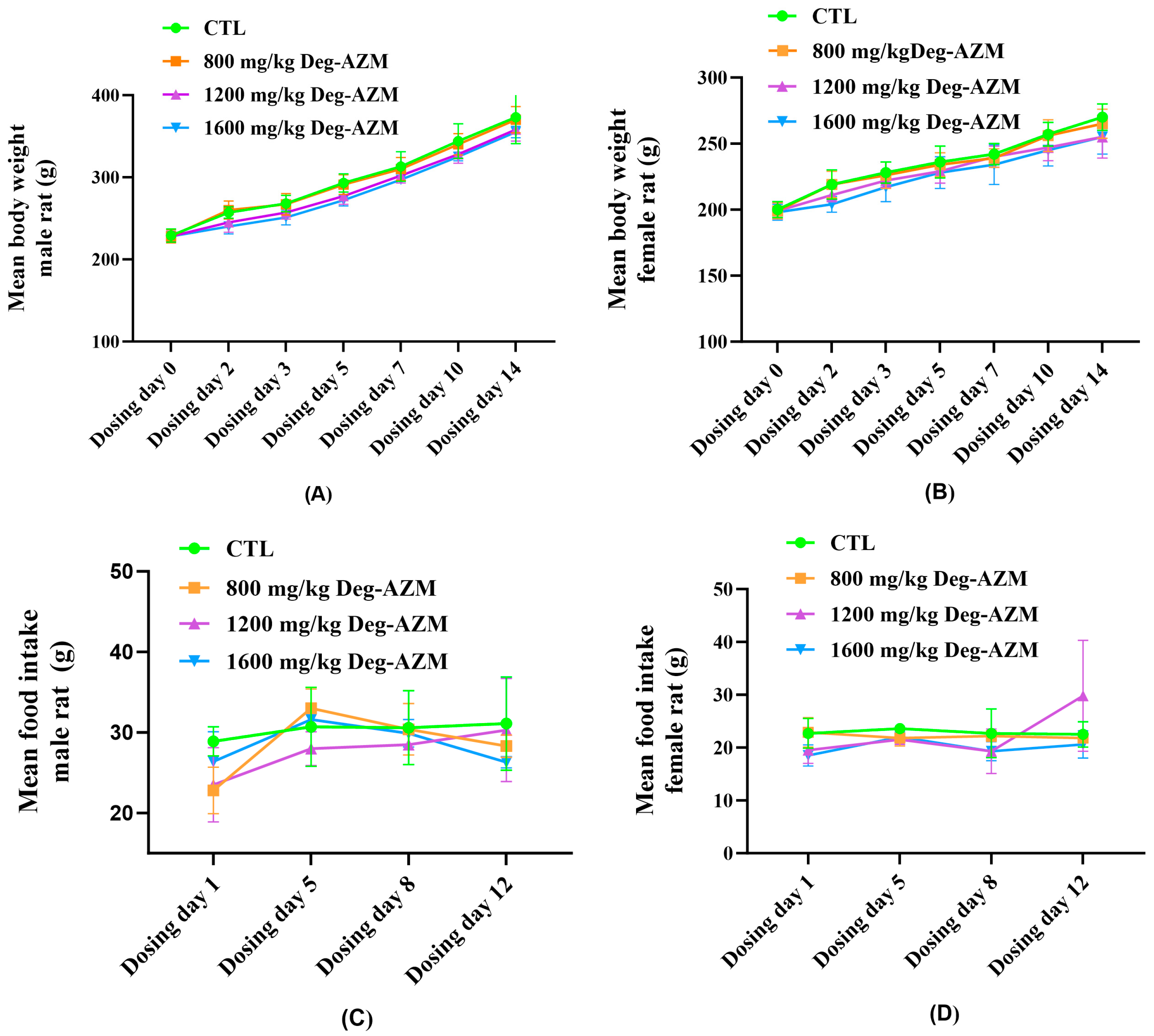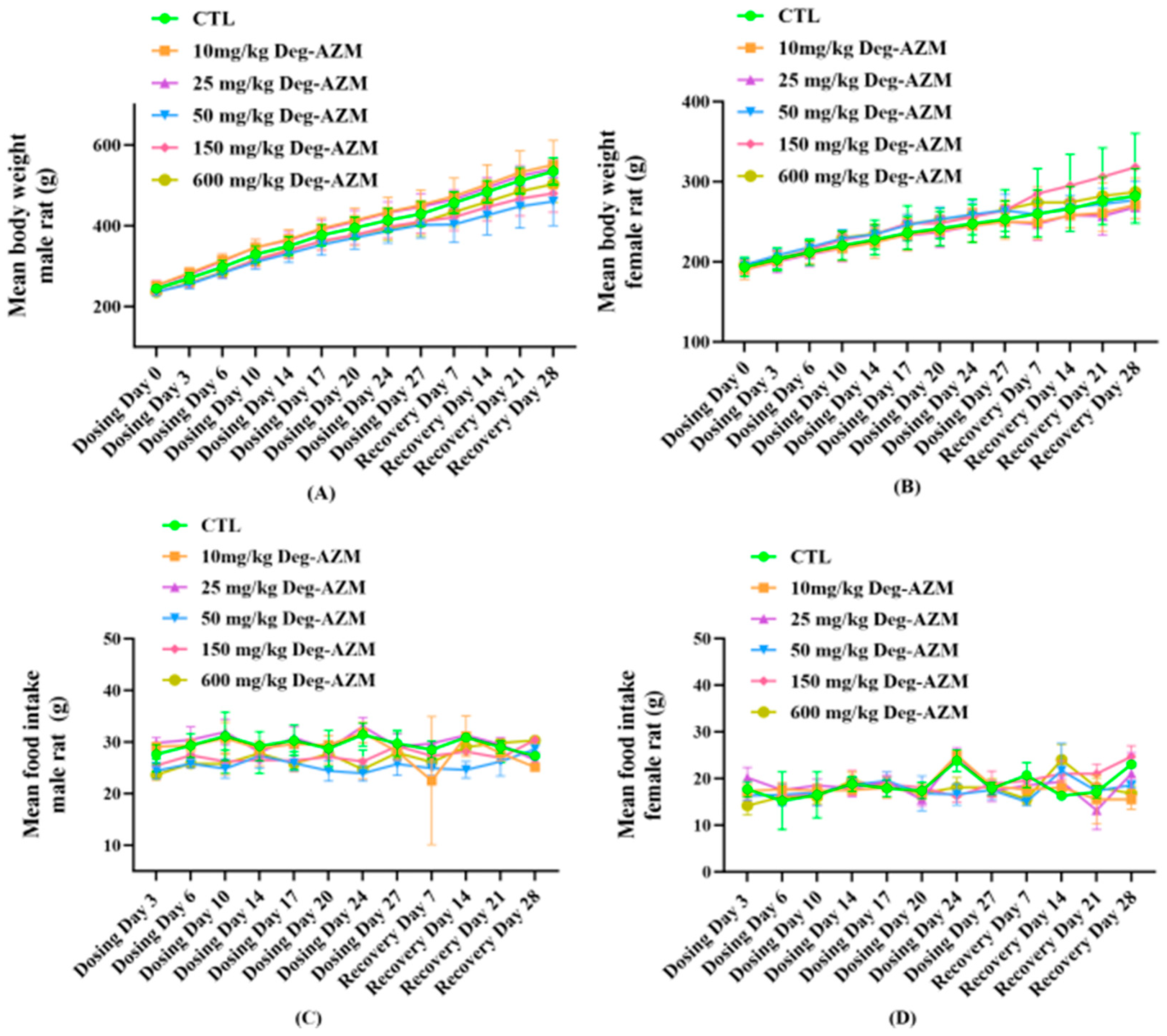 24]. A total of 180 healthy SD rats (90 males/90 females) were stratified by sex and body weight and allocated into six experimental groups (n = 30/sex/group), consisting of a CTL group and five treatment groups administered Deg-AZM at doses of 10, 25, 50, 150, and 600 mg/kg (suspended in 0.5% CMC-Na). The CTL group received the 0.5% CMC-Na vehicle solution, while treated animals were administered Deg-AZM at the corresponding doses via oral gavage once daily in the morning for 28 consecutive days at a dosing volume of 10 mL/kg, followed by a 28-day recovery period.