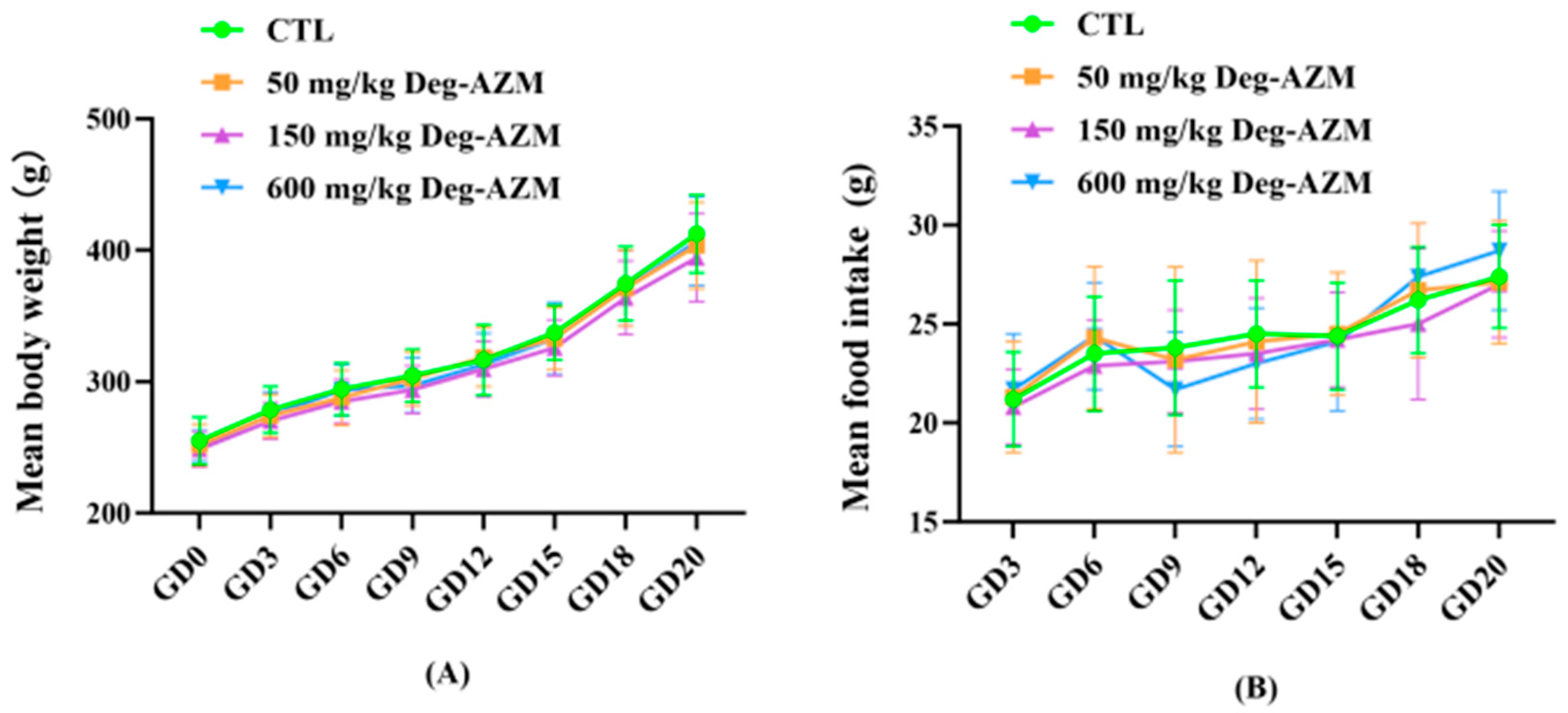 For the main trial, 105 mated females were randomly assigned by body weight to a vehicle CTL group (n = 23) and Deg-AZM treatment groups (50, 150, and 600 mg/kg groups; n = 23, 24, and 24, respectively). An additional toxicokinetic evaluation involved 55 healthy female rats, which were also randomized by body weight into a CTL group (n = 12) and Deg-AZM dose groups (50, 150, and 600 mg/kg; n = 12 per group). All animals were administered the test articles via oral gavage: the CTL group received 0.5% CMC-Na solution, while the Deg-AZM groups received respective doses once daily from GD 6 to 15 at a volume of 10 mL/kg/day, followed by a 28-day recovery period.