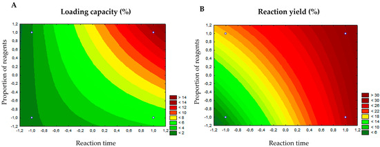 Response surface graph for the analyzed dependent variables. Legend: (A)—loading capacity; (B)—reaction yield. Both axes of figures A and B (x–Reaction time, and y–Proportion os reagents) go from −1.2 to +1.2 with an increment of 0.2. The time was counted in hours. The loading capacity in the Figure A expressed in the graph is represented from −2 to 16%, and the reaction yield in the Figure B is expressed from 0 to 35% with an increment of 5.