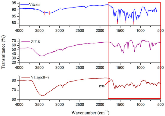 A new and discrete signal, non-existent in the FT-IR spectra of vitexin and ZIF-8, was observed at 1743 cm−1, and may be a sign of interaction between the chemical structures of the flavonoid and the MOF. This is a region of characteristic signals for ketones (1725–1705 cm−1) or for esters (1750–1730 cm−1) [64]. The ketone group exists in the structure of vitexin, but it is not commonly observed in its FT-IR spectrum, probably due to the intramolecular interaction that occurs between the carbonyl and the hydroxyl at position 5. As the carbonyl may be a site of interaction between the structure of vitexin and ZIF-8, it is believed that this discrete signal is an indication of the formation of a single structure, the VIT@ZIF-8 system. However, the characteristic signal for conjugation of this carbonyl with the 5-position hydroxyl was not suppressed in the spectrum of the system, which leads us to believe that there may be a remnant of vitexin not linked to MOF, as can be seen in the band present at 1631 cm−1 in the spectrum of the VIT@ZIF-8 system. Yet, this signal (1631 cm−1) may also indicate amine folding (1640–1550 cm−1), which is a functional group present in the ZIF-8 structure.