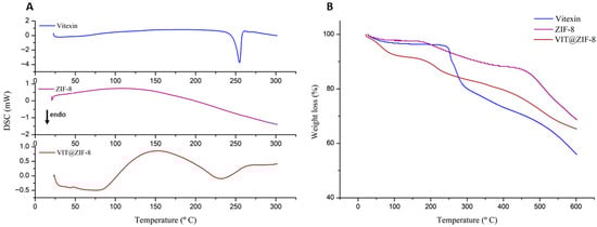DSC and TG curves for vitexin, ZIF-8, and VIT@ZIF-8 system. Legend: (A)—DSC; (B)—TG.