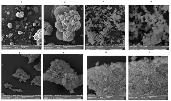 SEM photomicrographs for vitexin, ZIF-8, and VIT@ZIF-8 system. Legend: (A)—Vitexin (500× magnification); (B)—Vitexin (magnification of 2000×); (C)—ZIF-8 (magnification of 5000×); (D)—ZIF-8 (magnification of 15,000×); (E)—VIT@ZIF-8 (magnification of 2000×); (F)—VIT@ZIF-8 (magnification of 5000×); (G)—VIT@ZIF-8 (magnification of 10,000×); (H)—VIT@ZIF-8 (magnification of 15,000×).