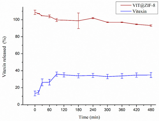 The release profiles of vitexin and the VIT@ZIF-8 system in phosphate buffer (pH 7.2) are shown in Figure 6. The difference between the two release profiles is clear. After 8 h (480 min) of experiment, vitexin release was 34.98 ± 3.50%, reaffirming its low aqueous solubility or very slow dissolution rate. Unlike what happened with VIT@ZIF-8, which was able to release all of the incorporated vitexin (100%) in the first minute, thus characterizing itself as an immediate release system, positively modifying the dissolution rate of vitexin.