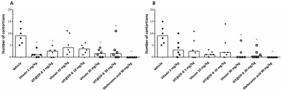 Figure 7A shows the number of contortions that occurred after the administration of oxytocin for each sample tested (vitexin and VIT@ZIF-8 at concentrations of 3, 10, and 30 mg/kg and mefenamic acid at 90 mg/kg) orally, over a period of 30 min, compared to the vehicle (phosphate buffer). When analyzing the effects of vitexin orally, it is possible to notice that at 3 and 30 mg/kg, there is a reduction in the number of contortions when compared to the negative control (p = 0.0003). The same did not occur for the 10 mg/kg dose, where it was evident that there was no statistical difference when compared with the vehicle. A similar pattern of response could be observed for VIT@ZIF-8, where a reduction in the number of contortions was noticed only at doses of 3 and 30 mg/kg (p = 0.0008). When the vitexin and VIT@ZIF-8 groups are compared at the same doses, it is noted that there is also no difference between the isolated vitexin and that carried in the ZIF-8 network, which leads us to believe that the increase in dissolution profile of vitexin did not influence its pharmacological activity in this model.