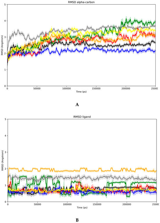 Molecular dynamics (MD) simulations were performed using GROMACS version 2019.2 [50]. On a Linux/Ubuntu workstation, to evaluate the structural and energetic stability of ligand–protein complexes obtained after dockings. Ligand topologies were generated using the automated topology builder (ATB) [51] online platform, employing the GROMOS 54a7 force field [52] for all components. Each complex was placed in the center of a cubic simulation box, which was then solvated using the SPC (simple point charge) [53] water model. To ensure system neutrality and physiological conditions, counter ions were added until a final ionic concentration of 0.15 M was achieved.
