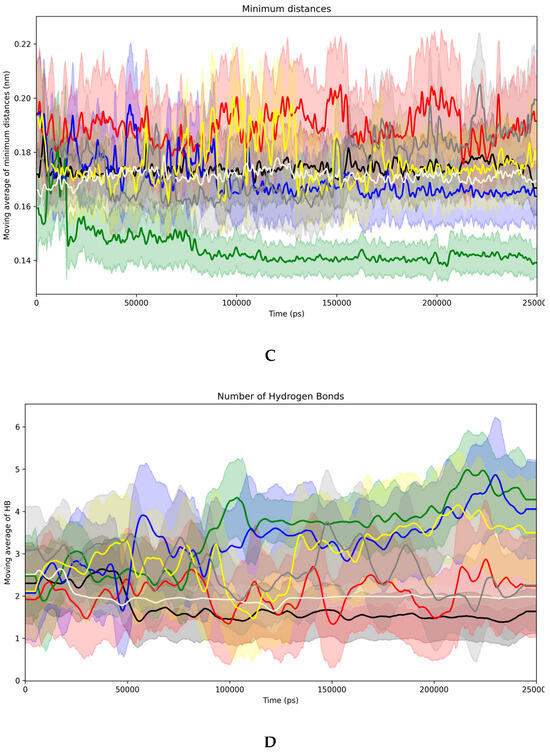 Graphs of RMSD (root mean square deviation in Å) of alpha carbons, RMSD of ligands, minimum ligand–protein distances, as well as the number of ligand–protein hydrogen bonds formed during the simulation were obtained. The curves of these data were smoothed with the moving averages of the original values. The graphs were generated in Python-3.10 via matplotlib-3.2.2 on a Linux/Ubuntu-20.04 environment.
