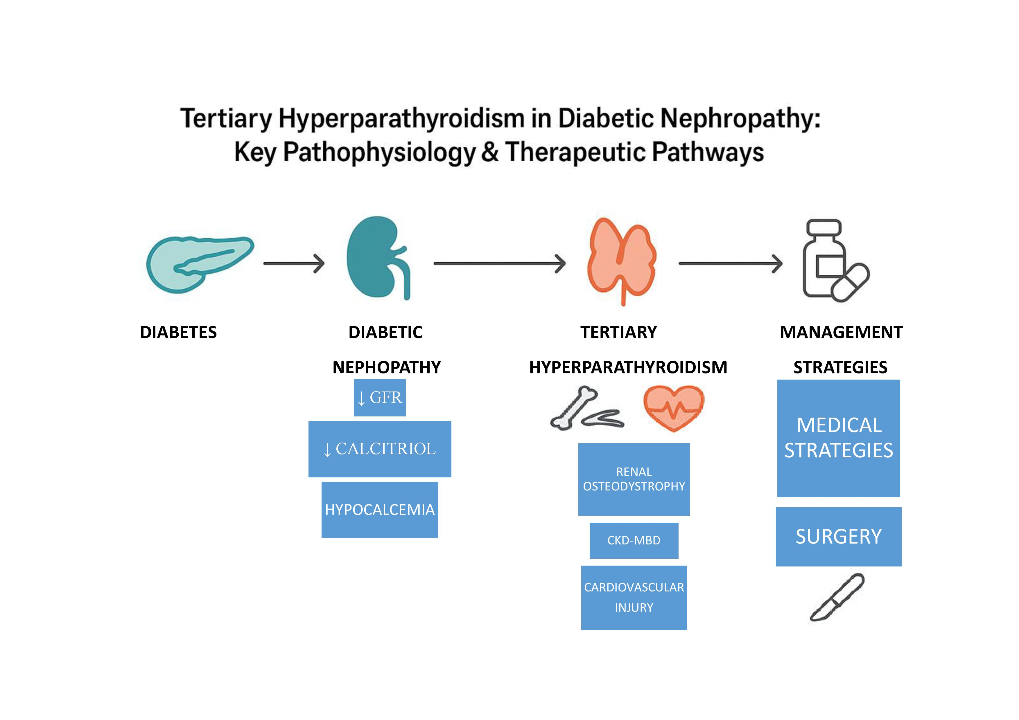 Diabetic nephropathy, a microvascular complication of diabetes mellitus, has become the leading cause of ESRD globally. The increasing prevalence of diabetes and its renal complications has significantly shifted the epidemiological landscape of chronic kidney disease (CKD) and related mineral and bone disorders. Patients with diabetic nephropathy experience a combination of metabolic derangements that affect calcium, phosphate, vitamin D, and PTH homeostasis. These patients often develop SHPT earlier and may have a more rapid progression toward tertiary hyperparathyroidism due to more severe and persistent alterations in mineral metabolism.