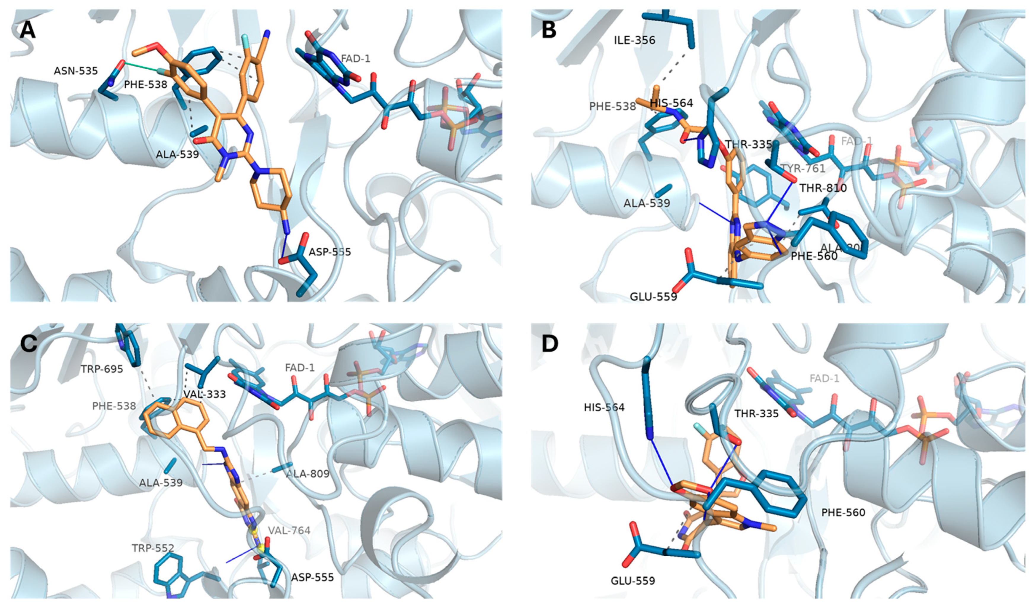 | DB16703 | −10.7 | THR-335, ALA-539, PHE-560, HIS-564 | ILE-356, PHE-538, GLU-559, TYR-761, ALA-809, THR-810 | |