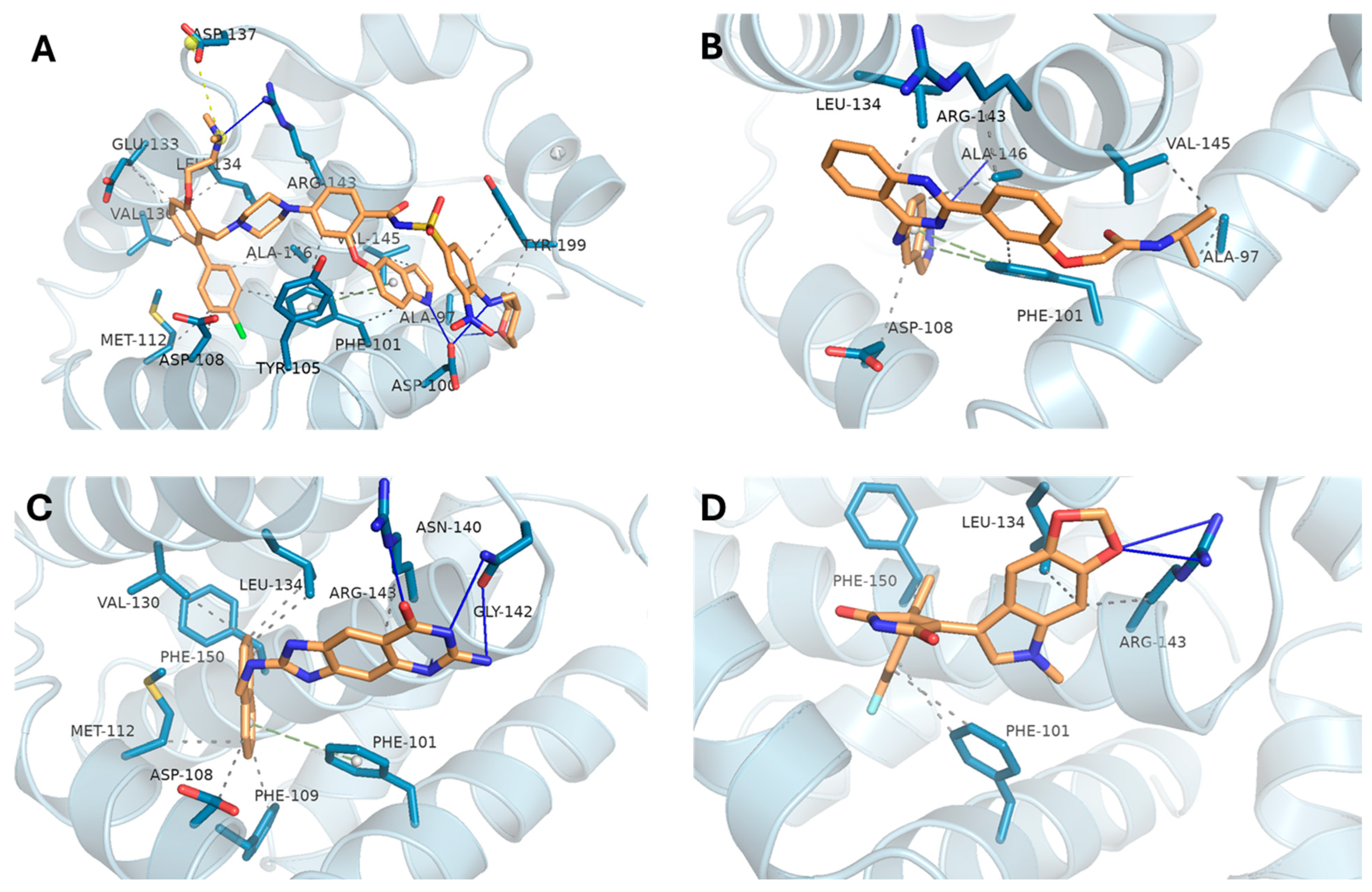 | DB16703 | −9.63 | ALA-146 | ALA-97A, PHE-101A, ASP-108A, LEU-134A, ARG-143A, VAL-145A, ALA-146A | |