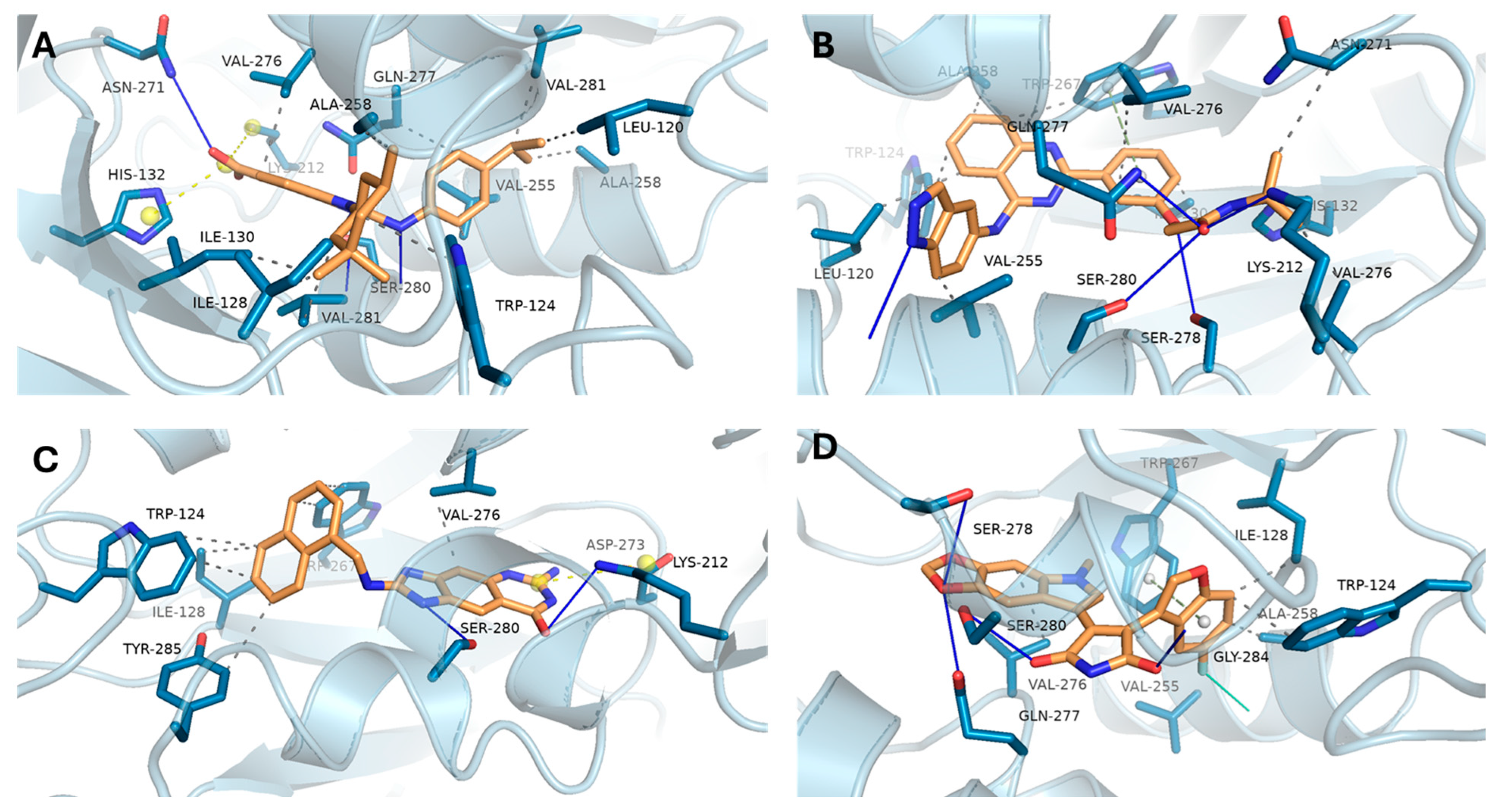 | DB08512 | −10.71 | LYS-212A, SER-280B | TRP-124B, ILE-128B, TRP-267B, VAL-276A, TYR-285B | |