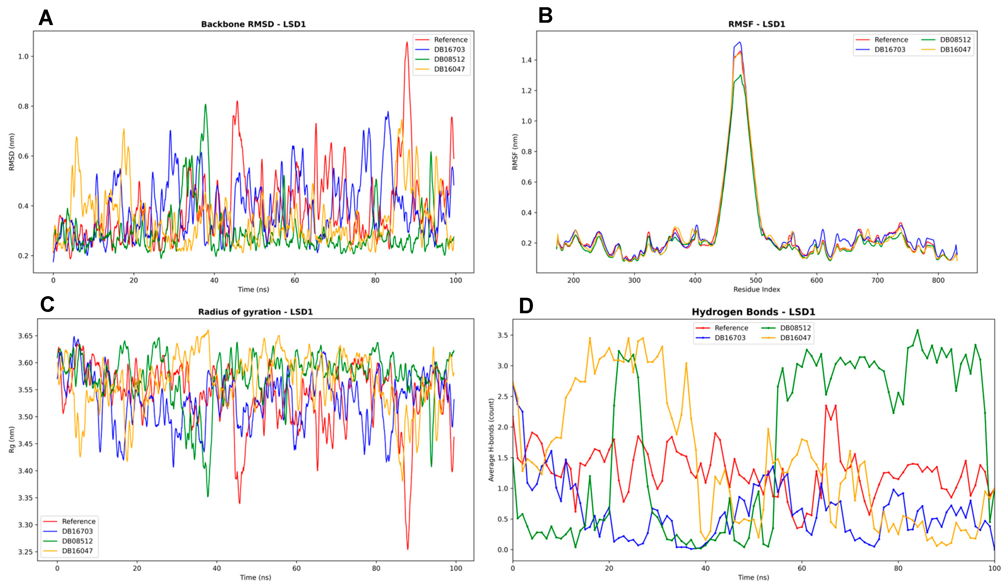 | LSD1 | Pulrodemstat | −8.42 | ASP-555 | PHE-538, ALA-539 |