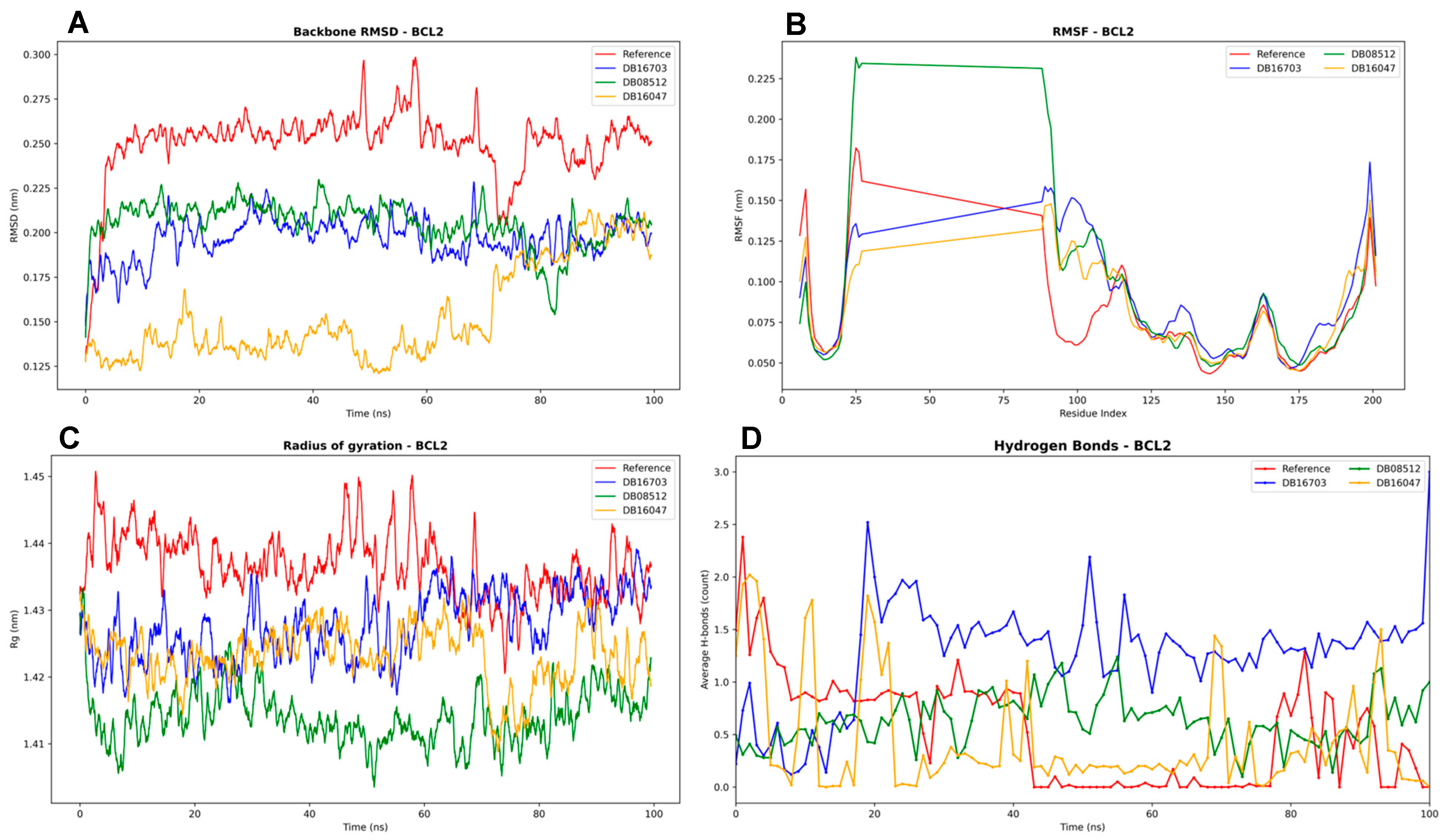 | BCL2 | BDBM178570 | −10.84 | ALA-97, ASP-100, ARG-143 | PHE-101, TYR-105, ASP-108, MET-112, VAL-130, GLU-133, LEU-134, ARG-143, VAL-145, ALA-146, TYR-199 |